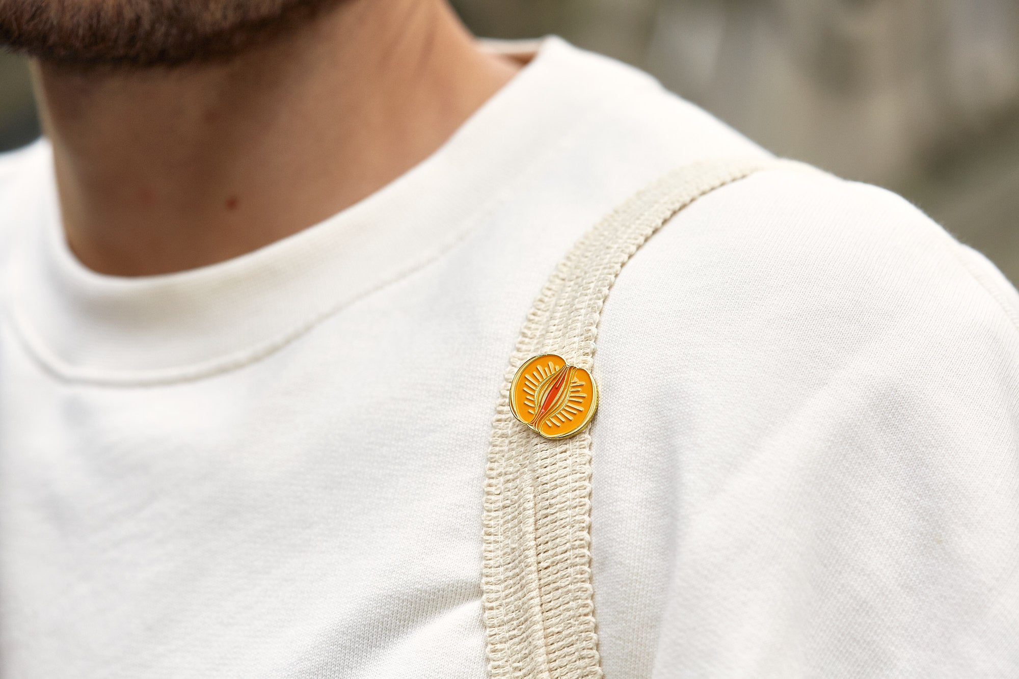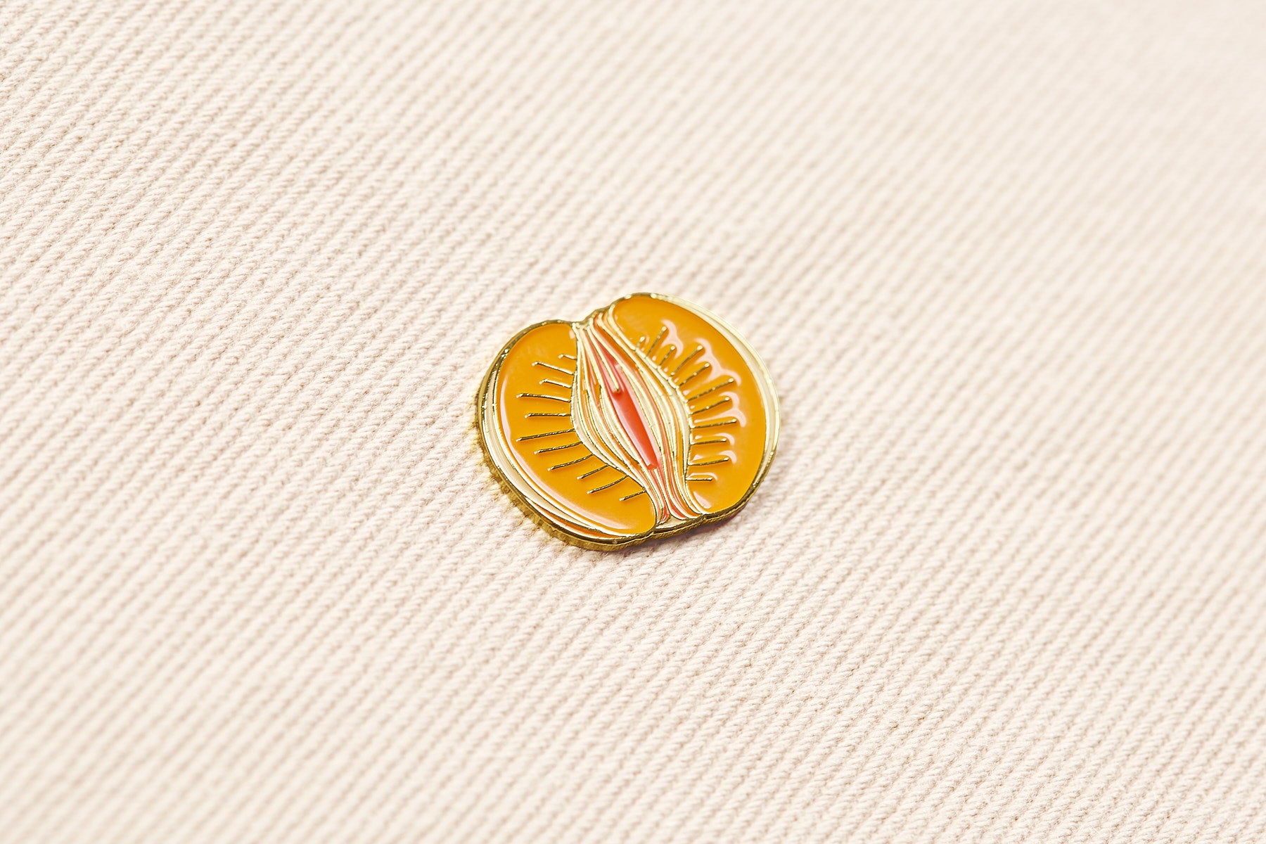 Visuelle Metaphern prägen die Kunstgeschichte – und diese kleine Anstecknadel setzt diese spielerisch-provokante Tradition mit modernem Flair fort. Und am Ende des Tages ist es doch nur eine Mandarine, oder?