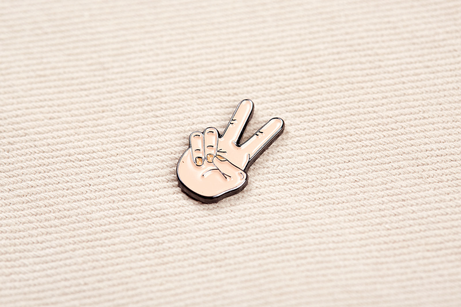Lässiger Emaille-Pin „Easy Peasy“ mit Peace-Geste für entspannte Vibes. Perfekt für Jacken, Taschen und als Statement für alle, die lieber chillen als hetzen.