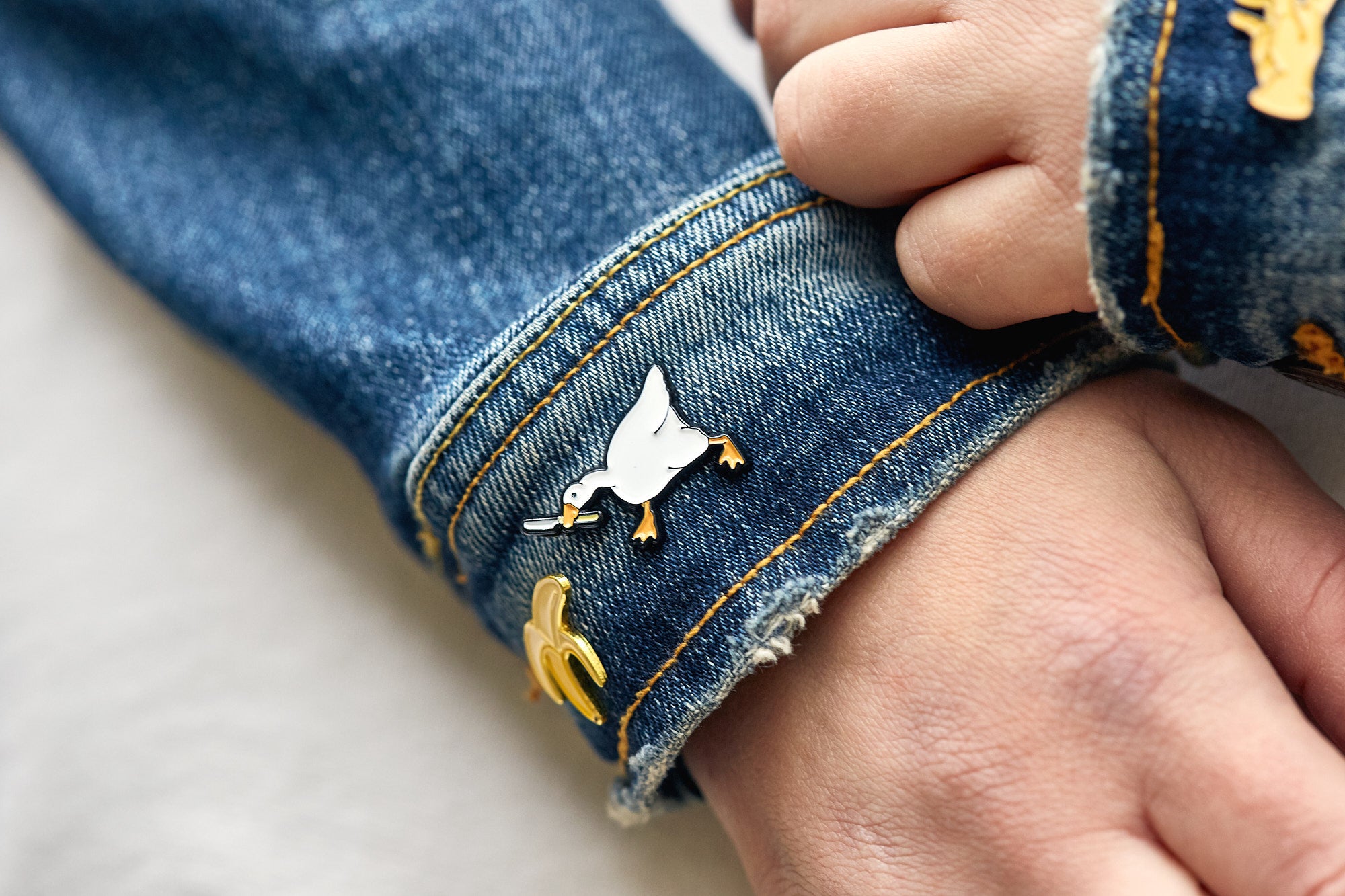 So hält dein Pin, was er verspricht: Drück die beiden Flügel vom Verschluss zusammen und zieh ihn ab. Pin an die gewünschte Stelle stecken, Verschluss wieder drauf – fertig! Solange sich der Verschluss nur mit Druck löst, sitzt alles sicher.