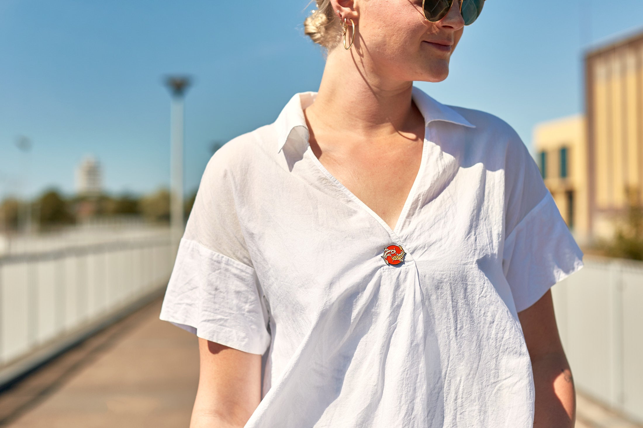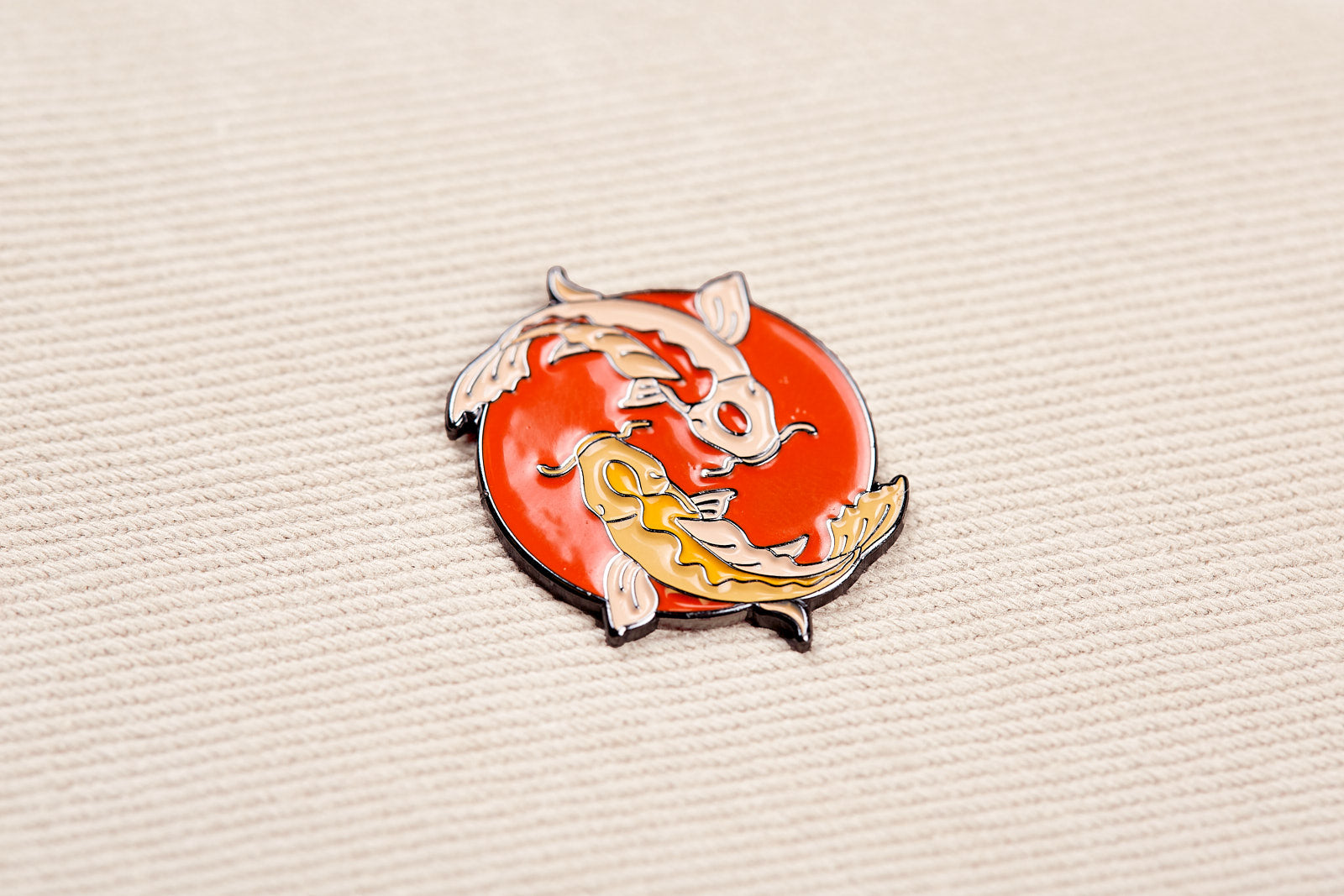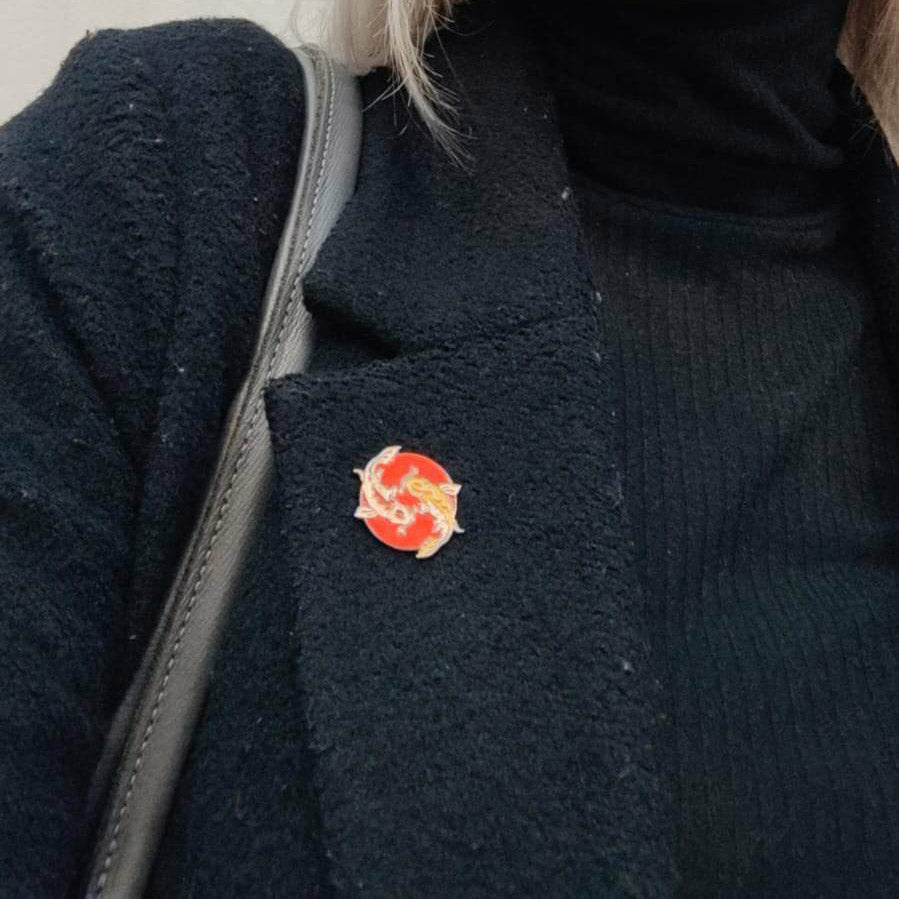 Harmonious "Feng Koi" yin-yang enamel pin featuring white and orange koi fish in red sea. Perfect for jackets, bags, and adding balanced Eastern symbolism to any collector's accessories.