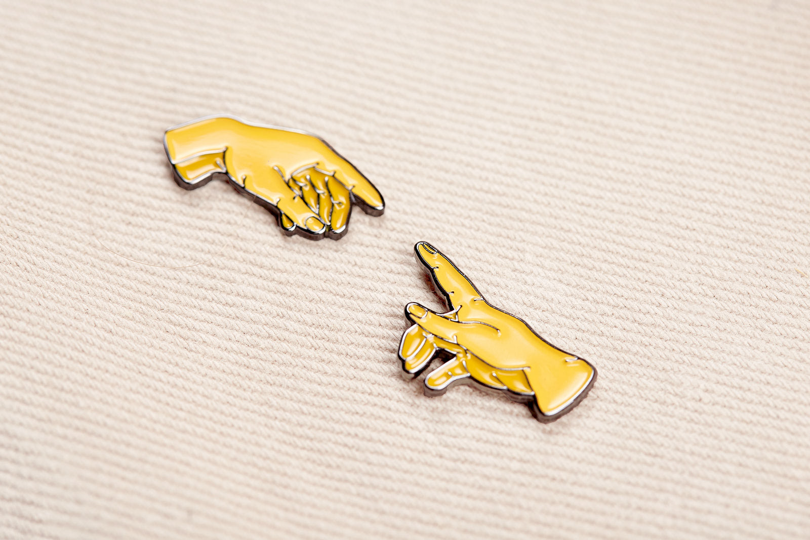 Artistic "The Creation" enamel pins depicting Michelangelo's iconic finger-touch moment. Perfect for jackets, bags, and adding cultural significance to any art lover's collection.
