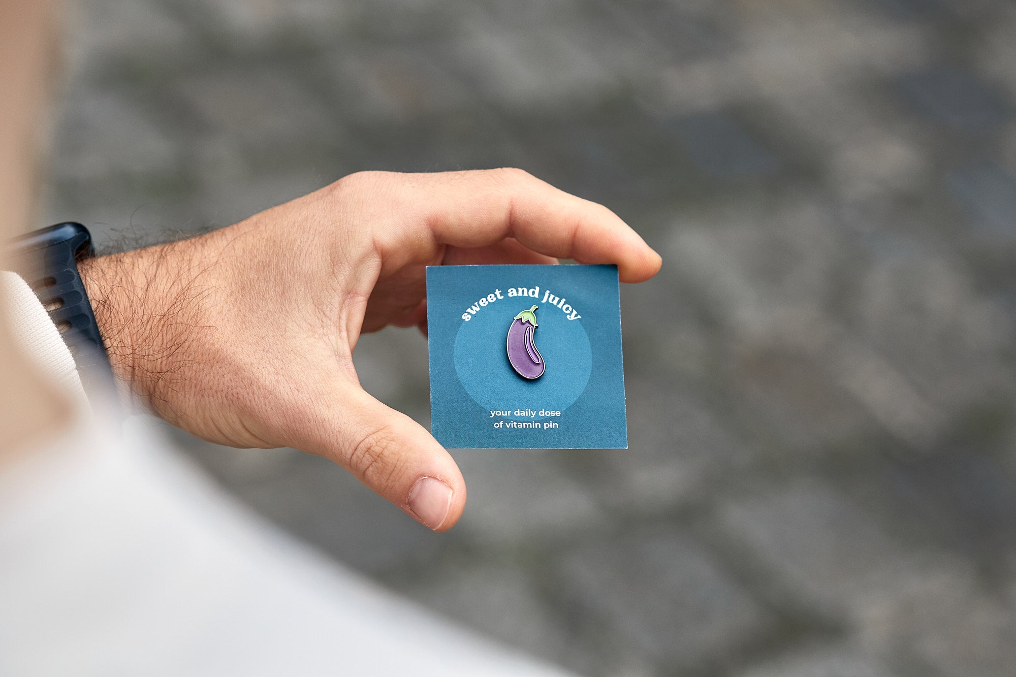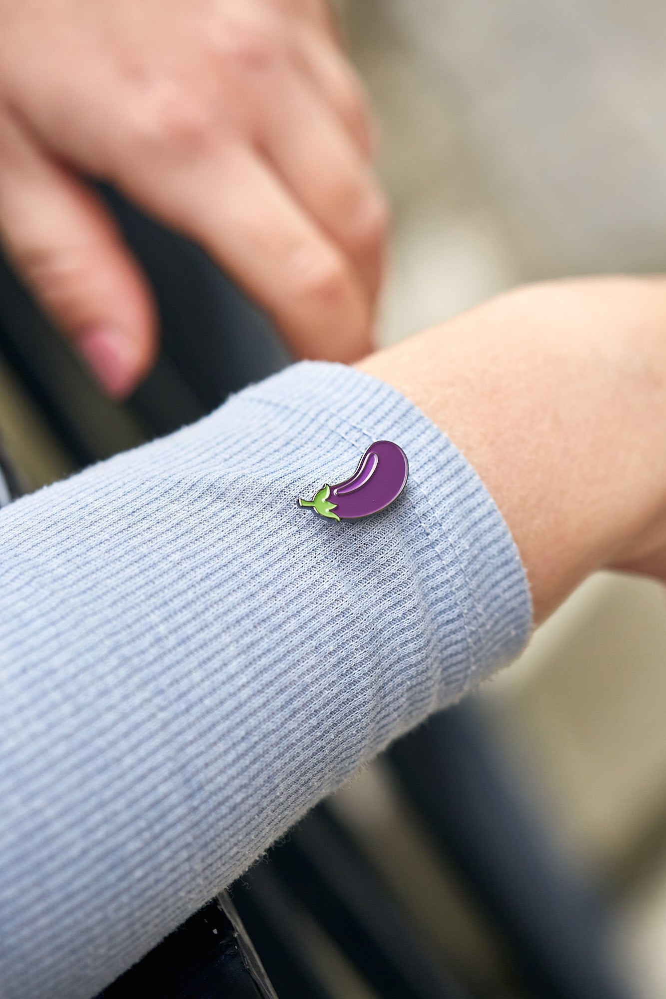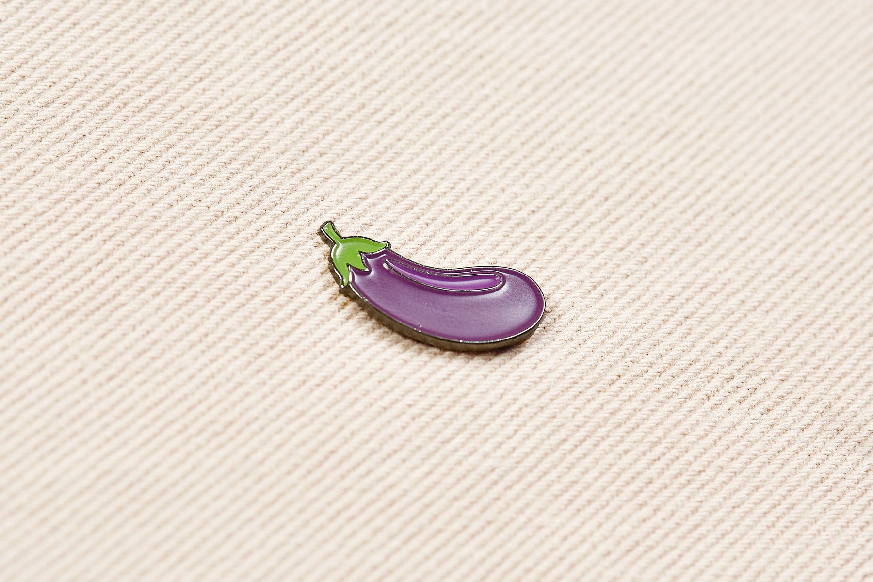 Bold auberginius enamel pin with impressive size and suggestive appeal. Perfect for jackets, bags, and adding cheeky humor to any fashion-forward collection.
