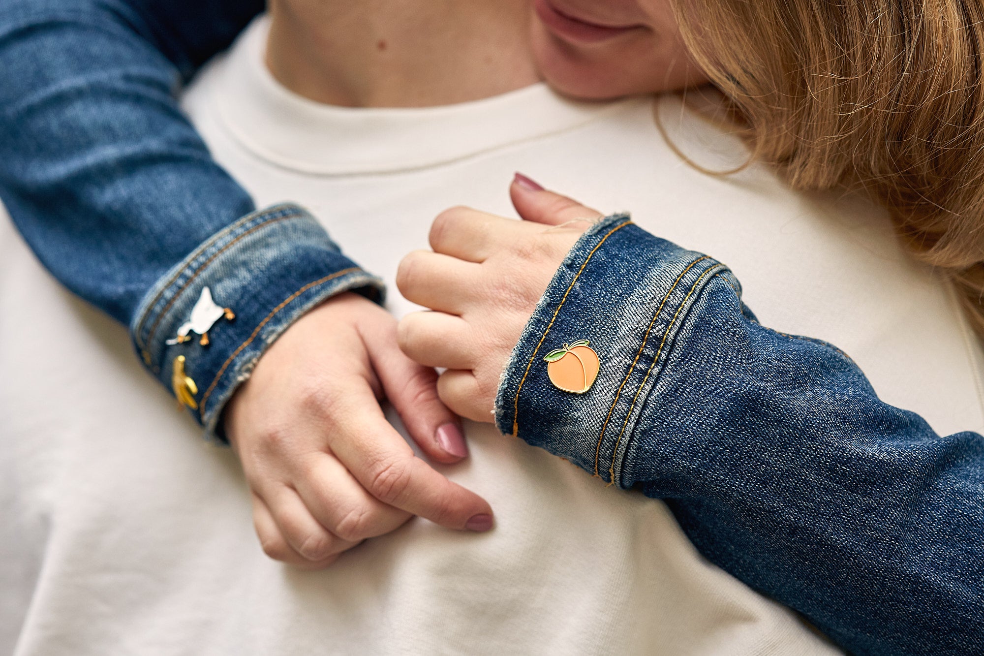 To attach your pin, press the clutch wings and pull to remove it. Place the pin where you want it, then reattach the clutch while pressing the wings. If the clutch doesn’t come off without pressing, your pin is secure— Easy-peasy, lemon squeezy!